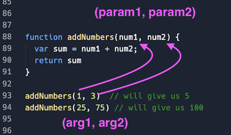 - We pass new values to the parameters each time we call the function by passing arguments in the invocation.